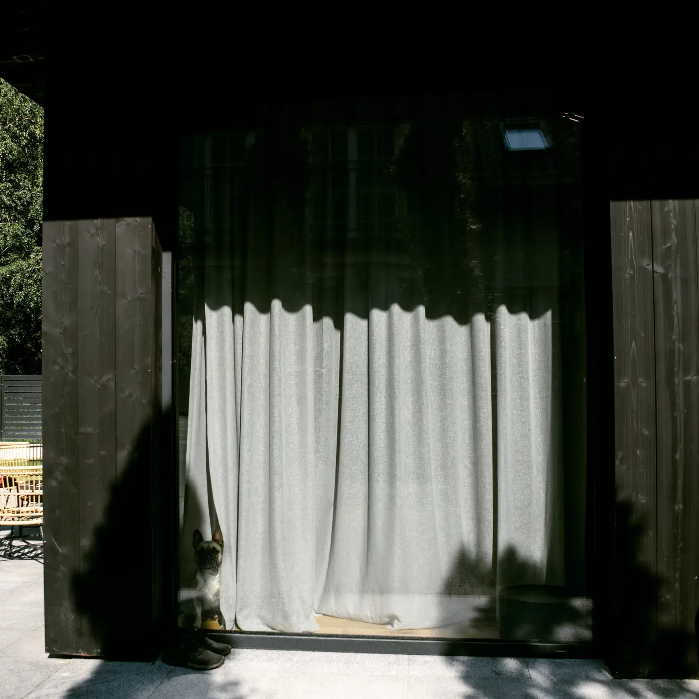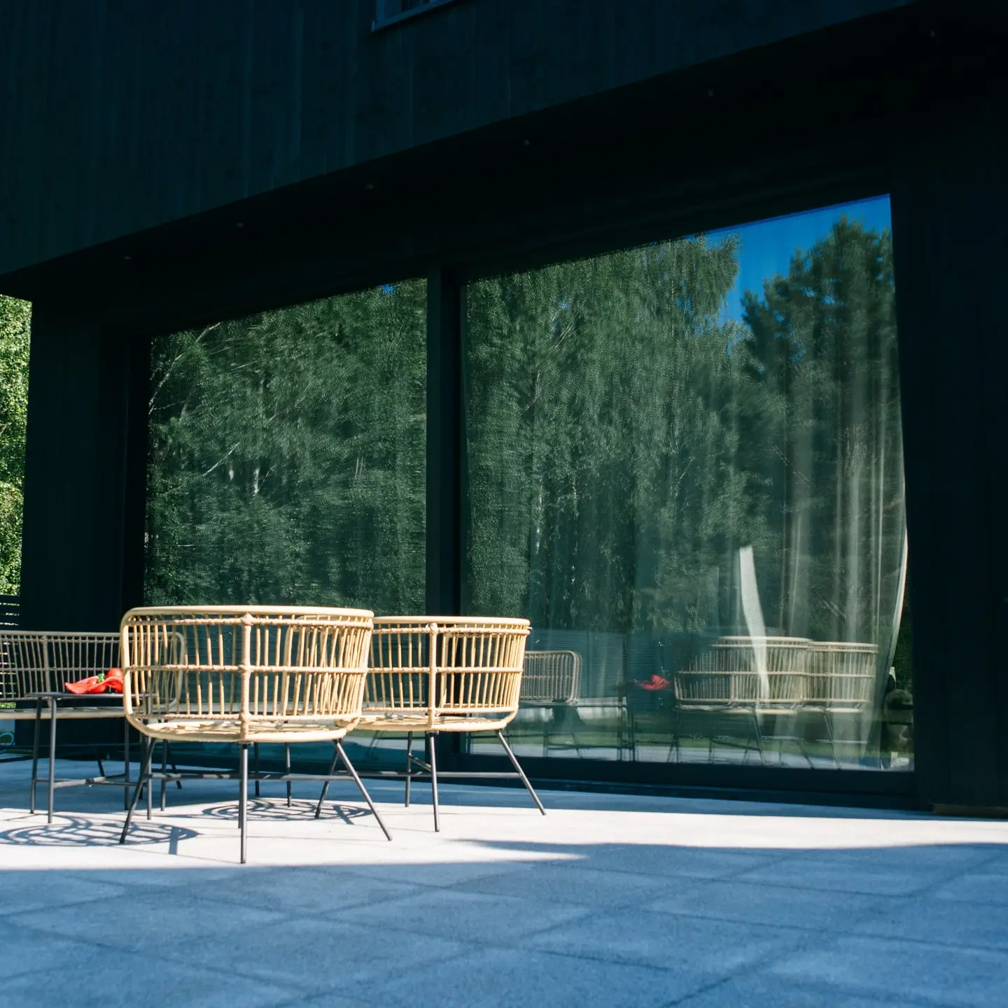 Wielkogabarytowe przeszklenia wpuszczają dużo naturalnego światła, skutecznie doświetlając przestrzeń wewnątrz.
